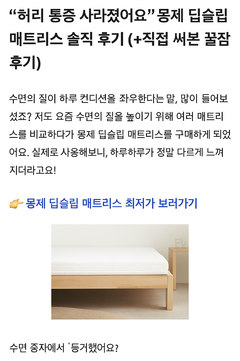 <h1>“허리 통증 사라졌어요” 몽제 딥슬립 매트리스 솔직 후기 (+직접 써본 꿀잠 후기)</h1>카테고리 없음 2025. 4. 30. 23:57